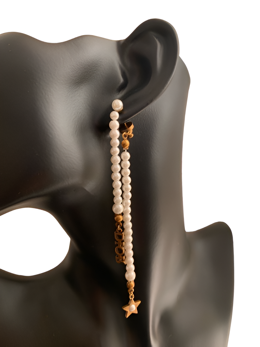 Make a stunning statement with these Dior Pearl & Star Drop Earrings. Featuring elegant strings of pearls with delicate gold accents and Dior's iconic logo, these earrings finish with a star-shaped charm for a touch of celestial beauty. Perfect for formal occasions or adding a sophisticated flair to your everyday look.