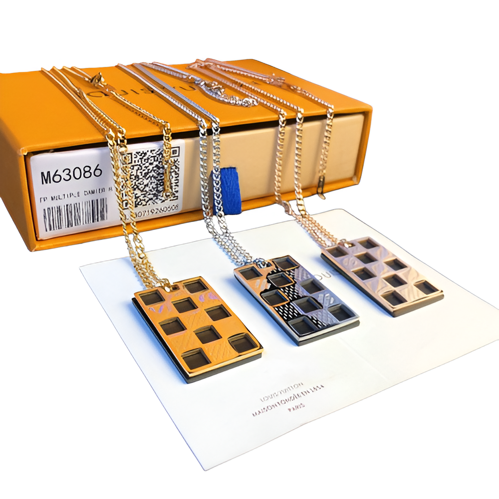 This exclusive set of three Louis Vuitton geometric pendant necklaces is perfect for the modern man. Each pendant features unique square designs in gold, silver, and black, combining style with bold elegance. These eye-catching pieces make a statement for any occasion.