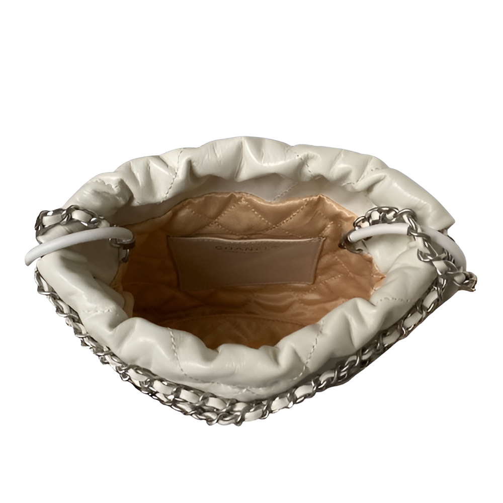 The 👜 Chanel-Inspired White Drawstring Quilted Bag is a sleek and versatile accessory perfect for everyday use. Made from premium synthetic leather, this bag features a quilted design with a silver-tone chain and drawstring closure. The iconic branding and charm add a touch of luxury to this modern piece. Comes with complete box packaging. Delivery takes 10 to 14 days.