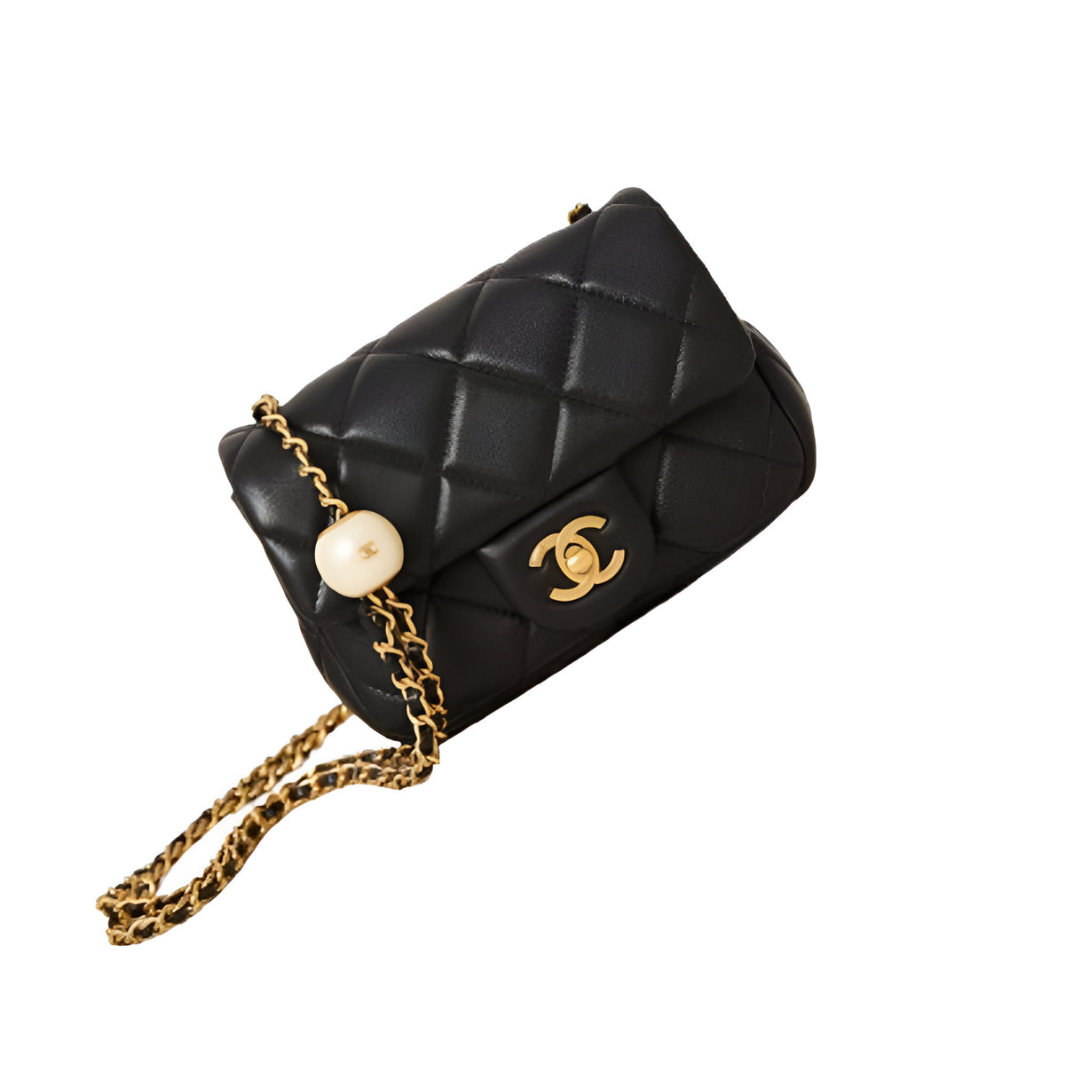 Complete your look with the CHANEL Quilted Black Mini Flap Bag featuring a chic pearl accent. Crafted from luxurious quilted leather, this mini bag combines timeless elegance with modern details. The gold-tone chain strap and interlocking "CC" logo add a touch of sophistication, making it perfect for both casual and formal occasions.
