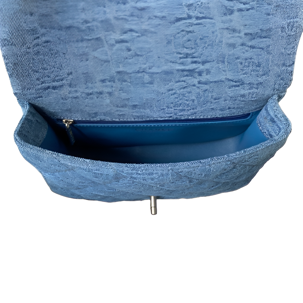 Bring a fresh pop of style to your collection with the CHANEL Quilted Blue Mini Flap Bag. Designed in a beautiful quilted blue fabric, this chic mini bag is both stylish and practical. Featuring the iconic CHANEL logo, a silver-tone chain, and a heart-shaped accent, this bag is perfect for complementing both casual and formal looks.