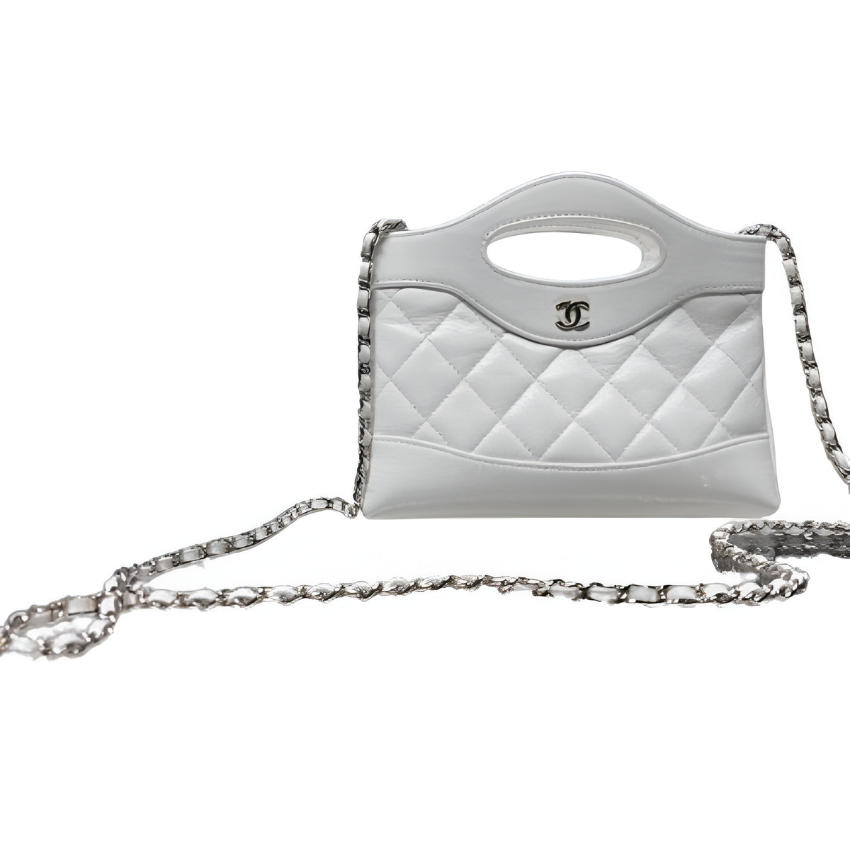 Add a modern twist to your collection with the CHANEL Quilted White Hand-Held Chain Bag. This unique bag features a sleek cut-out handle combined with the classic CHANEL quilted leather design. The silver-tone chain strap allows for versatile styling, making it perfect for both day and evening occasions.