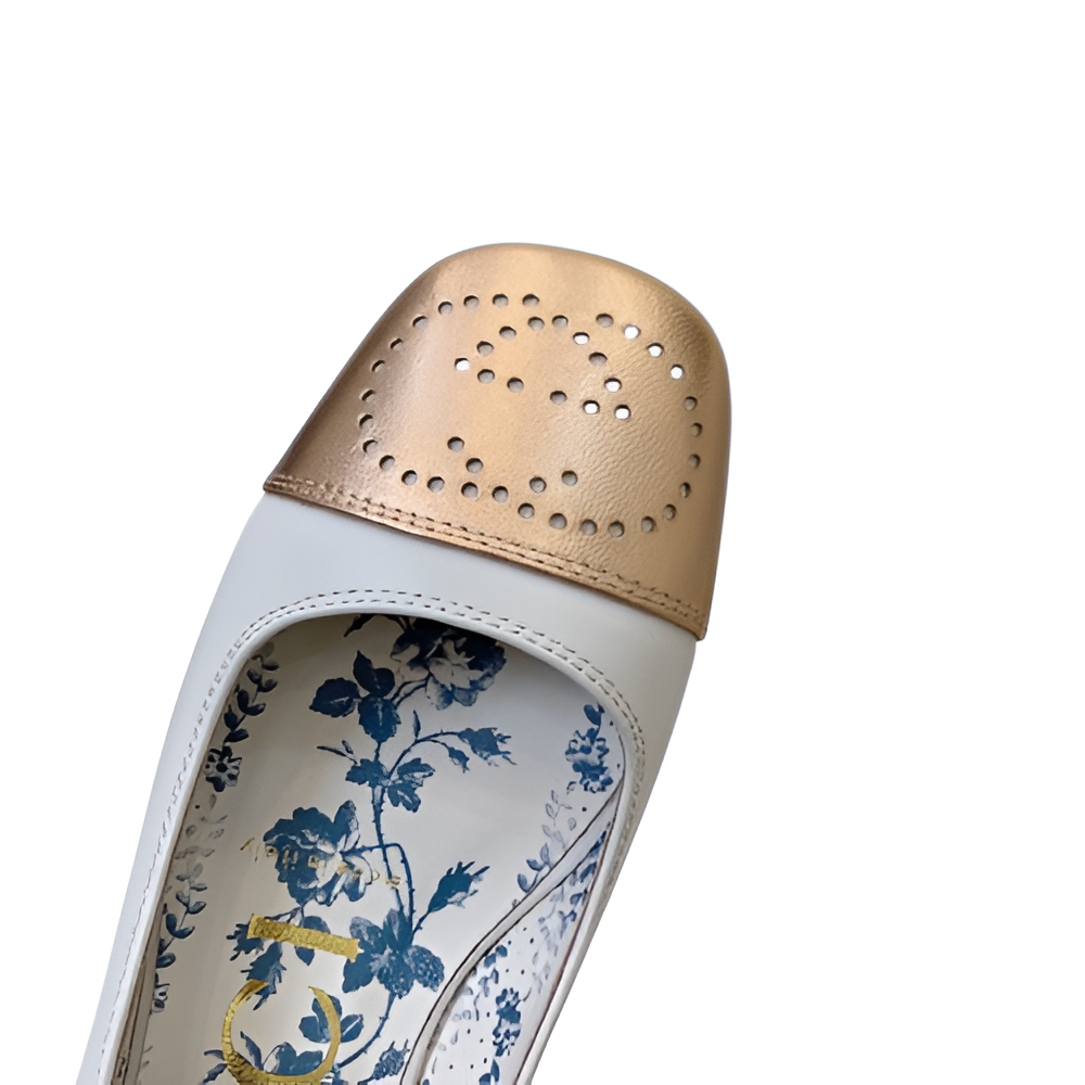 These Gucci ballet flats are the perfect combination ofย comfort. The unique floral lining inside gives a beautiful, artistic touch, while the gold-tone metallic toe cap adds a pop of luxury. Ideal for any casual or semi-formal setting, these flats will keep you stylish all day.