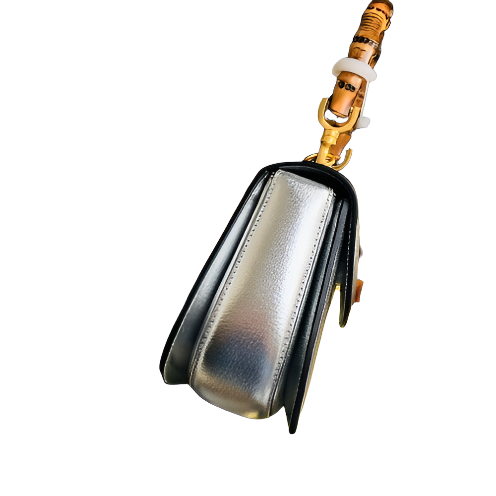 This iconic Gucci Bamboo 1947 Mini Top Handle Bag is a timeless piece designed for the modern woman. Crafted from premium metallic leather and featuring a distinctive bamboo top handle and gold-toned bamboo closure, this bag is both stylish and functional.