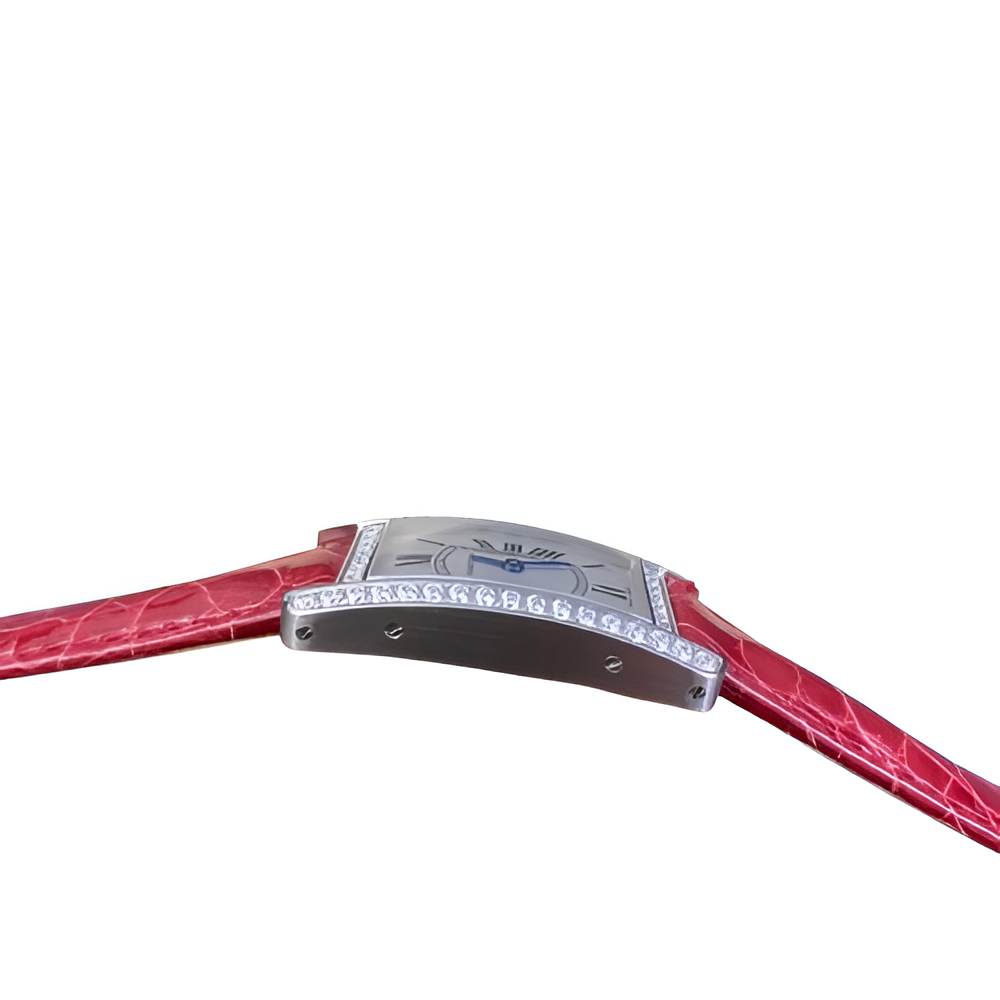The Cartier Tank Américaine for women is a bold and luxurious timepiece, designed for those who seek elegance with a pop of color. Featuring a diamond-set bezel and a striking red leather strap, this watch commands attention. Its rectangular silver dial with Roman numerals and Cartier’s signature blued hands adds to its timeless charm. Powered by a quartz movement, it offers precision alongside its stunning design.
