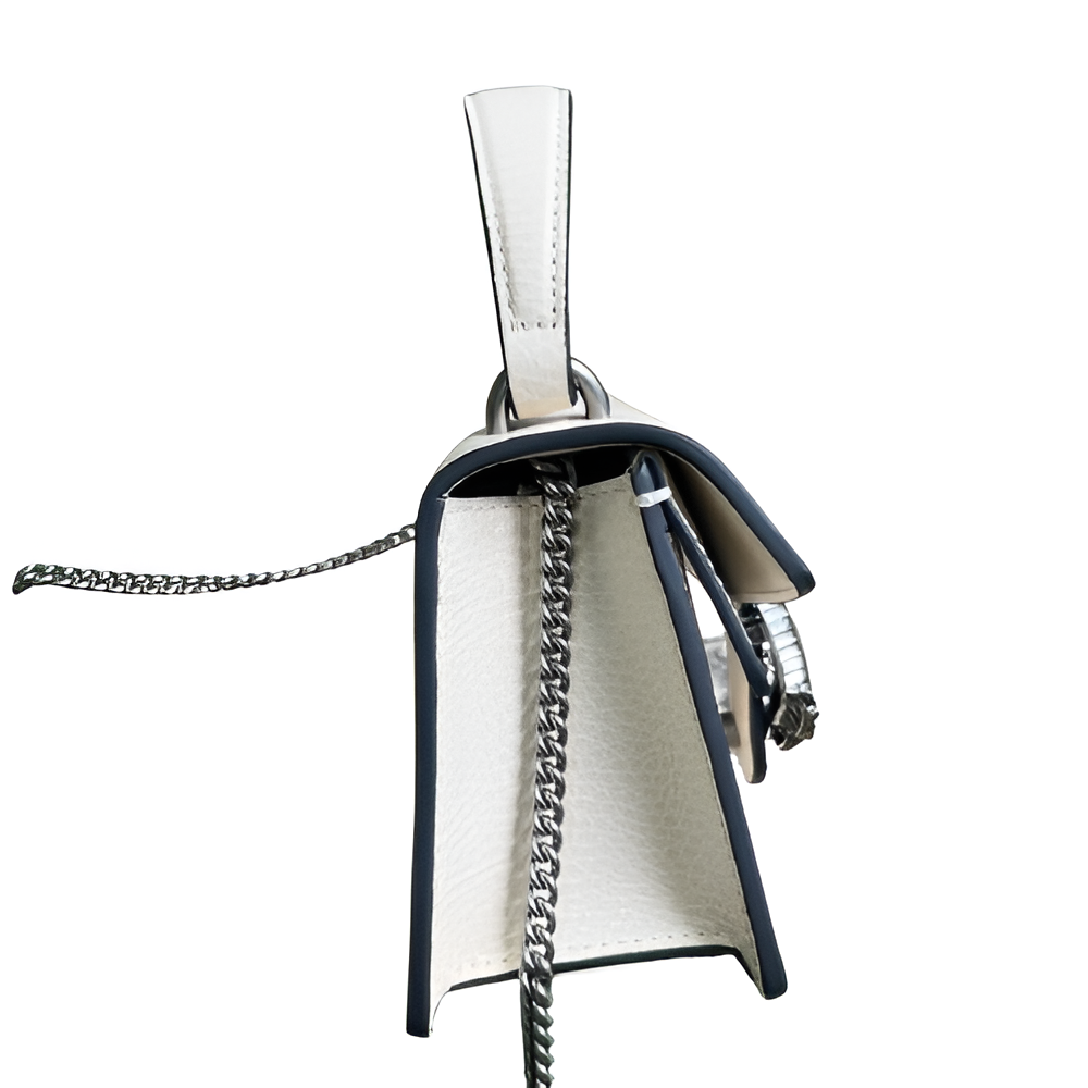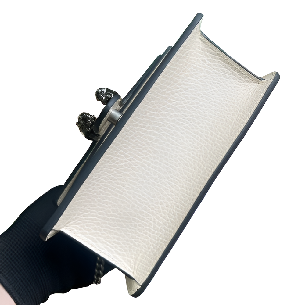 This GUCCI Mini Dionysus bag in soft white leather is the perfect accessory for a chic and modern look. The signature silver-tone tiger head closure and compact size make it a stylish yet practical choice for your essentials.