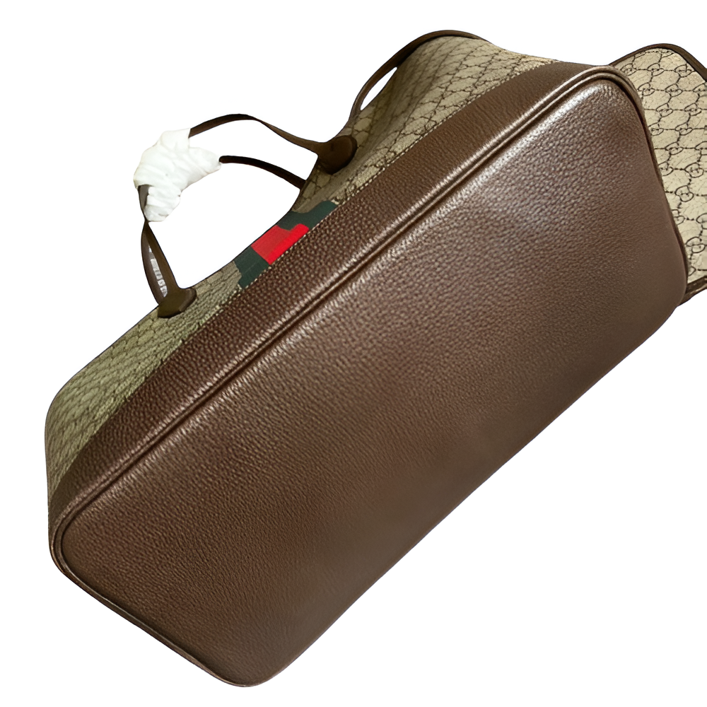 This spacious GUCCI Ophidia GG Supreme tote bag features the iconic GG monogram pattern and signature green and red web stripes. With its roomy interior and durable design, this bag is perfect for travel or daily use, combining style and practicality.